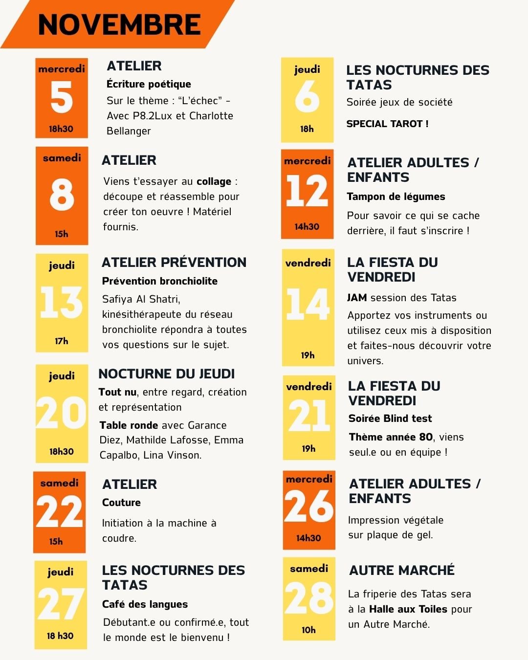 Alors n’hésitez pas à passer boire un verre, participer à un atelier ou venir simplement dire bonjour — chaque visite, chaque café partagé, c’est un vrai coup de pouce pour l’asso ! Et n'oubliez pas, chaque jeudi c'est NOCTURNE jusqu'à 21h30